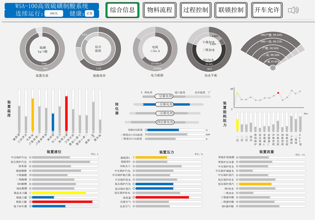硫酸裝置由一張綜觀畫面顯示,可以通過綜觀畫面全面了解到硫酸裝置的健康狀態(tài),綜觀畫面信息由KPI數(shù)據(jù)組成。為了體現(xiàn)綜觀畫面簡潔明了,綜觀畫面采用儀表面板風(fēng)格,對不同類型數(shù)據(jù)進(jìn)行區(qū)分,使操作員一目了然不用在大腦里轉(zhuǎn)換。