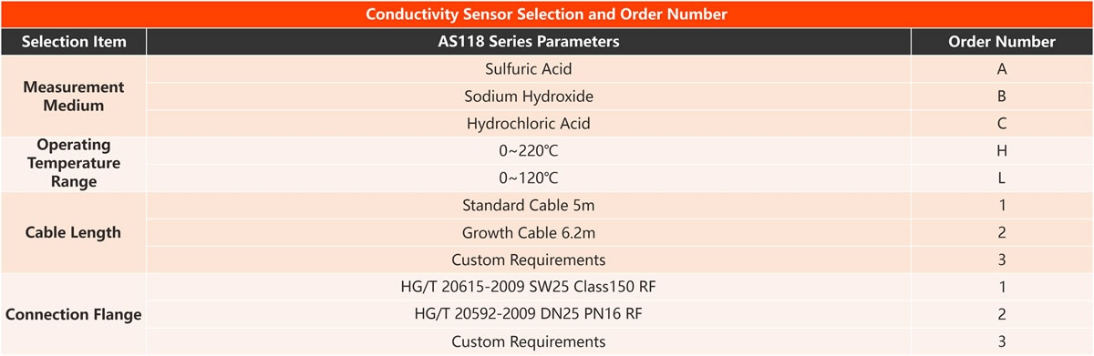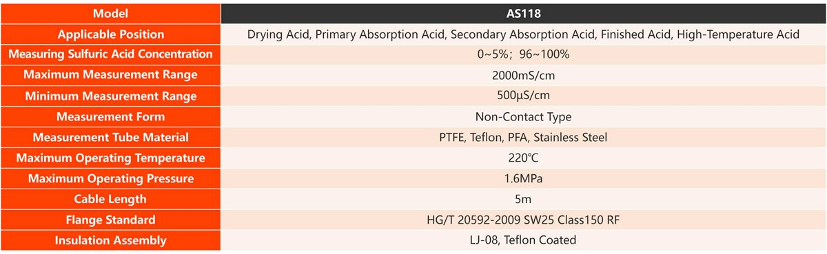 The AS118 sensor is suitable for applications in a variety of environments such as high temperature acids, dry acids, one-suck acids, finished acids, and diluted sulfuric acids. The measurement accuracy of the sensor is not affected by the flow rate and direction of the medium, but it cannot measure the conductivity of the medium containing gas, so it is necessary to ensure that the measurement medium is flowing and does not contain gas. The measuring tube of the AS118 sensor is made of stainless steel and lined with teflon, the mounting flange is made of corrosion resistant material, and the temperature sensor is installed as a standalone element in the temperature sleeve at the sensor outlet. The sensor's induction coil is mounted on the outside of the teflon-lined measuring tube, allowing medium such as high-temperature sulfuric acid or lye to flow inside the measuring tube.