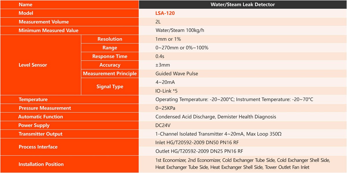 The LSA-120 water vapor leak detector, as the third generation product, can accurately detect the presence of water and steam leaks in the system. The device uses high-precision pulse detection technology, self-leakage calculation model and automatic control program to ensure its safety and environmental friendliness, and is specially designed for sulfuric acid plants. It is suitable for automatic detection of water vapor leakage in sulfur acid boiler system and automatic discharge of condensed acid from I and II economizers. In addition, it is also suitable for the health check of drying tower and one suction tower demister. The LSA-120 is ideal for sulphuric acid plants due to its measurement accuracy, environmental protection and safety and maintenance-free features./p>