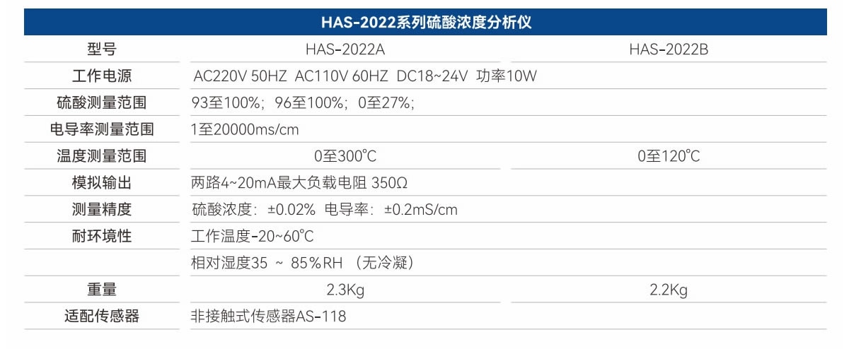 HAS-2022酸濃分析儀是一款采用專業(yè)針對硫酸行業(yè)設(shè)計(jì)制造的分析儀。內(nèi)置硫酸濃度補(bǔ)償趨勢不懼工藝介質(zhì)溫度變化。可輸出硫酸濃度或電導(dǎo)率。采用鋁合金一體成型結(jié)構(gòu),防護(hù)等級為 IP66外殼具有通用安裝選項(xiàng),可放心安裝在硫酸裝置區(qū)域。