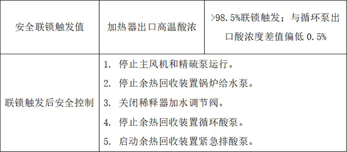 When there is a serious leak inside the sulfuric acid unit or the waste heat recovery unit, or the diluter water acid concentration control fails, resulting in the sulfuric acid concentration inside the waste heat recovery unit falling below the safe value, the safety interlock system will be triggered to shut down the unit and restore it to a safe state. This measure is designed to protect the device from major corrosion and prevent the company from shutting down for a long time.