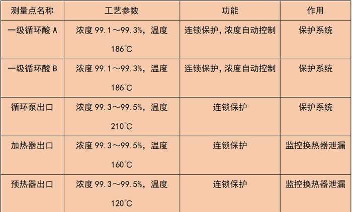 The waste heat recovery system of the sulfuric acid plant uses concentrated sulfuric acid in the production of sulfuric acid to absorb the heat released by SO3 to heat the deoxygenated water to produce 0.6MPa low-pressure steam, accounting for about 27% of the total recovery heat of the sulfuric acid plant. In the operation of the waste heat recovery system, the higher the temperature of sulfuric acid, the faster the corrosion rate of the alloy. In order to reduce the corrosion rate of the alloy of the waste heat recovery system, the sulfuric acid concentration should be greater than 99% in the design operation of the system, and the design temperature of sulfuric acid is 220℃. If the sulfuric acid concentration is lower than 99% and the corrosion rate of the alloy will be fast at high temperature. In order to ensure the safe operation of the waste heat recovery device, five high-temperature acid concentration meters are designed in the system to protect the operation safety and automatic concentration control of the device. The installation position is shown in Table 1. It can be seen from the installation position that five high-temperature acid concentration meters are crucial in the device, so mastering the measurement principle of the conductivity sensor can better solve the measurement problem and the maintenance problem of the instrument.