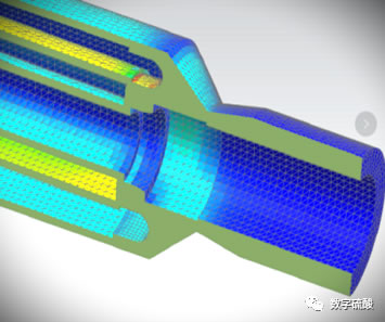 The nozzle is sealed with thread line, which realizes that there will be no liquid sulfur leakage in 800 ℃ high temperature cold and heat shock. In order to reduce the probability of weld leakage in the sulfur burning furnace, there is only one weld in the gun body through clever design, and through the stress relief design, the weld can be effectively prevented from tearing due to stress concentration. The finite element stress analysis of the weld of the steam insulation sleeve can be seen that the stress at the weld of the steam insulation sleeve is very low