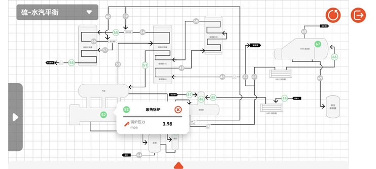 硫平衡圖中展示了液態(tài)硫磺經(jīng)燃燒生成二氧化硫,在催化劑作用下與氧氣反應(yīng)生成三氧化硫,最終通過接觸法轉(zhuǎn)化為硫酸的全過程。而硫-水汽平衡圖則直觀呈現(xiàn)裝置運(yùn)行期間,脫鹽水轉(zhuǎn)化為中低壓蒸汽的過程。