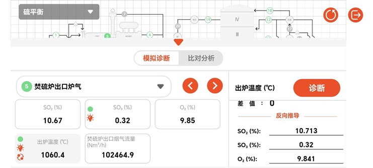2.轉(zhuǎn)化健康診斷展示轉(zhuǎn)化器各段的溫差、出口氣濃、總轉(zhuǎn)化率、層阻力與尾排SO?。