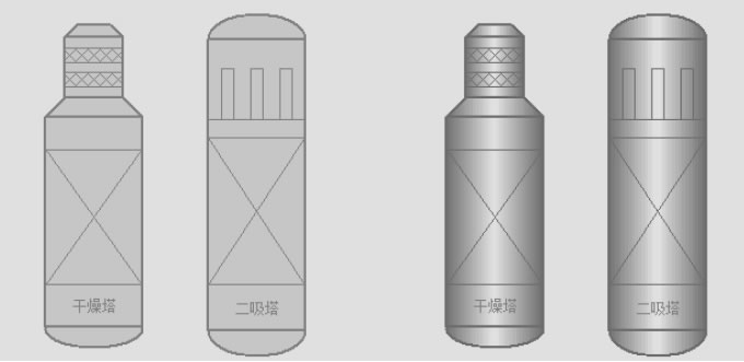 Component illustrations employ actual physical characteristics for rapid operator recognition. Component colors can be customized per client requirements, enhanced with 3D effects. The drying tower and secondary absorption tower serve as exemplars, as shown in Figure 2.