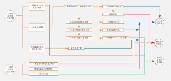 一吸塔除霧器帶酸會造成下游管道和設備腐蝕,相應地硫酸裝置開車率也必然會下降。下游中間冷熱換熱器的反復封堵會使受限空間的作業次數增多,安全風險增加。【1】